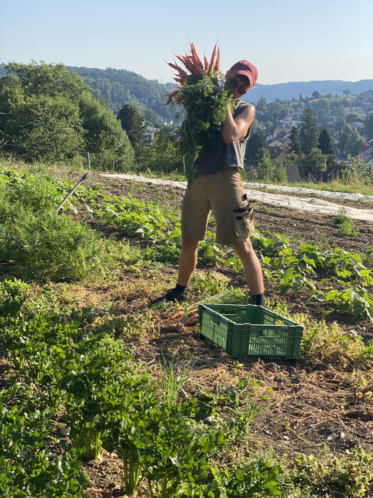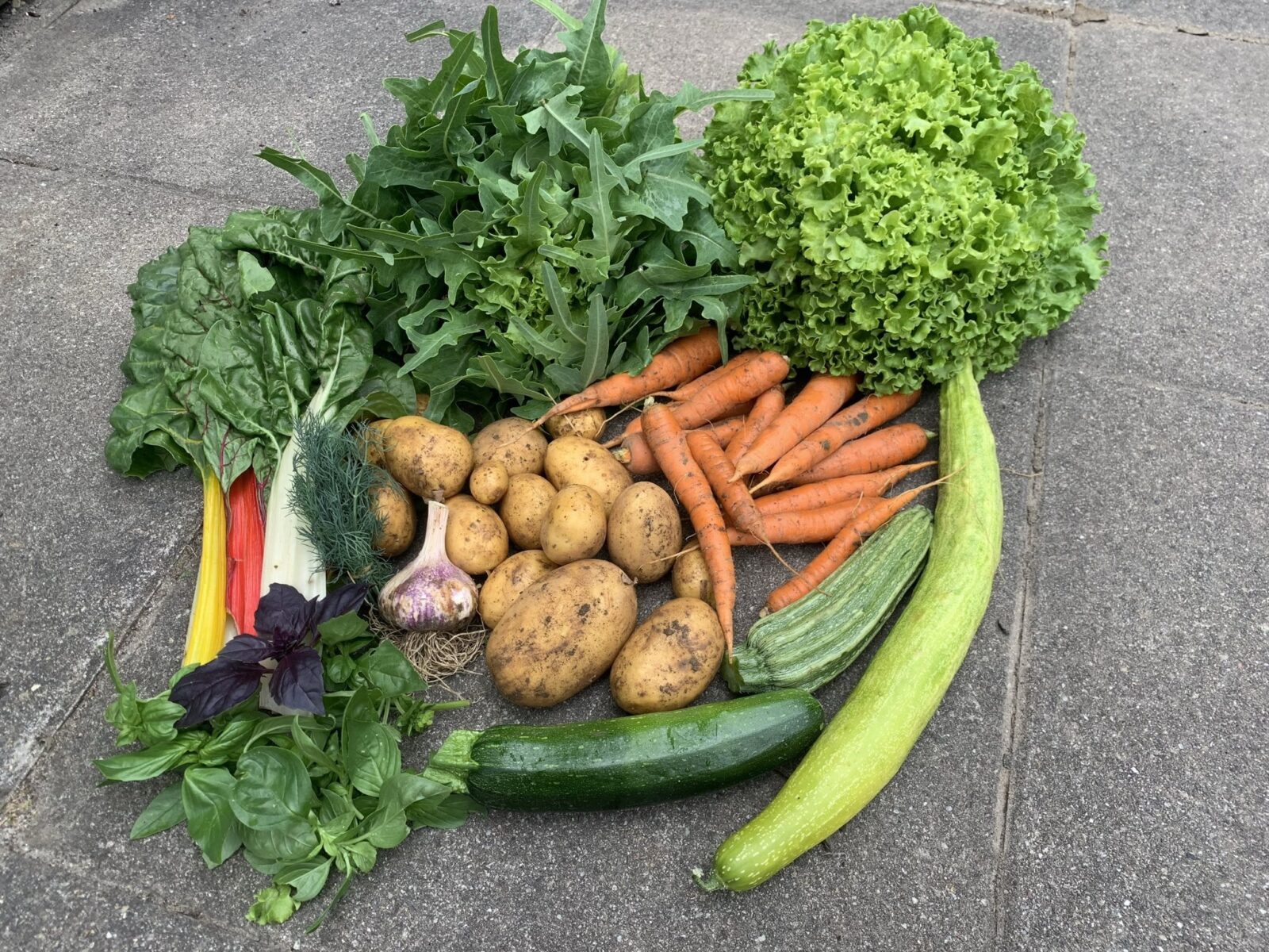 Dafür eine schöne Frühkartoffel-Ernte von der Oberen Wanne in Liestal und prächtiges Gemüse von uns selber. Wir konnten sehr schöne Rüebli ernten, die Gurken legen langsam los, die Zucchetti explodieren, die Salate konnten wir mit Wassergaben bei Laune behalten und so kam ein wunderbarer Korb zusammen: