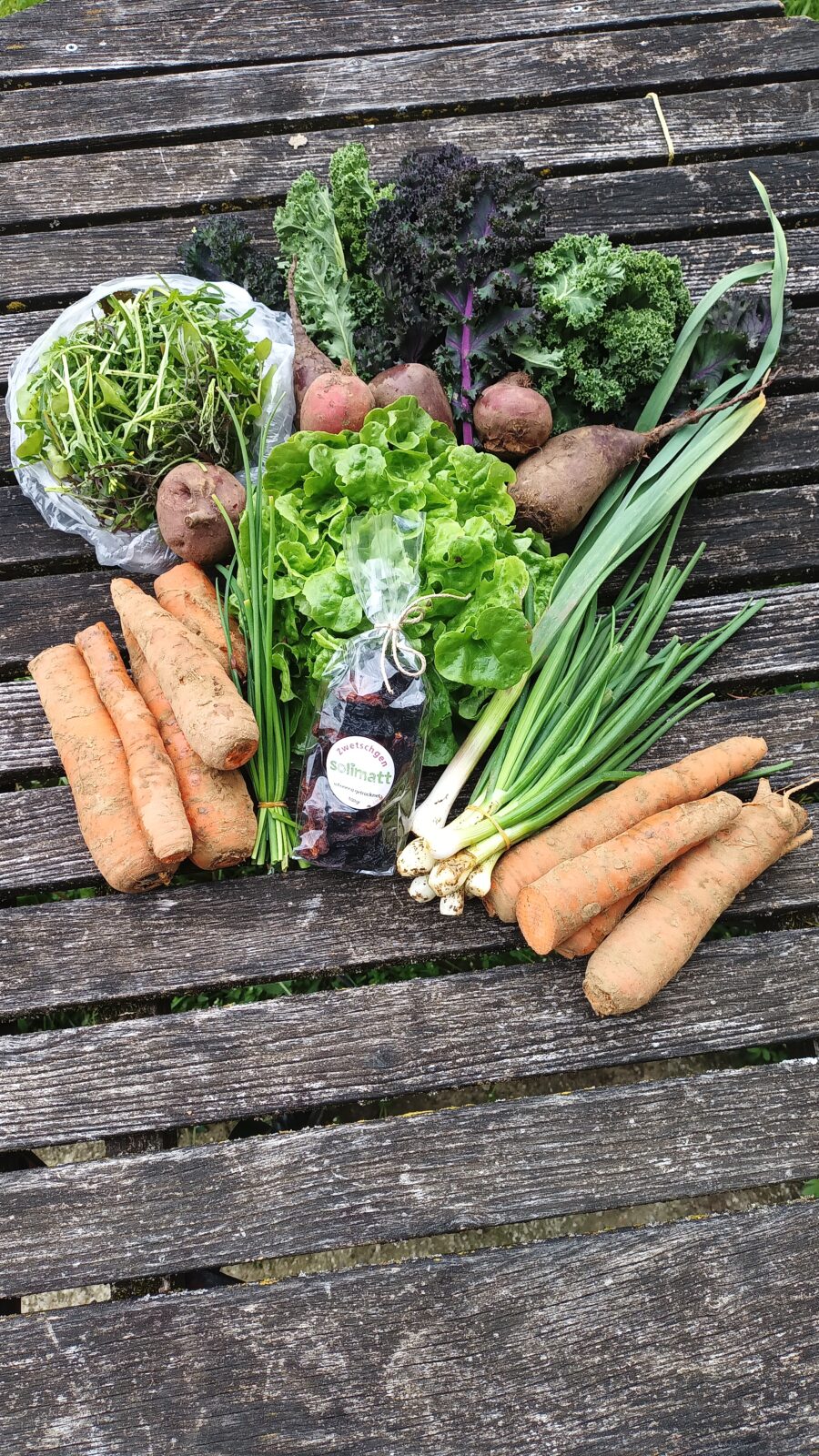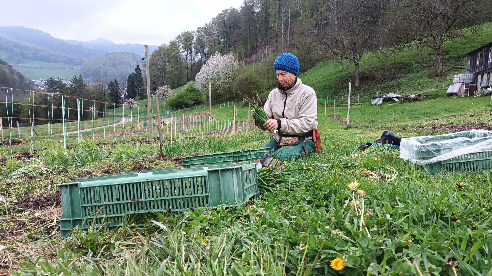 Diese Woche haben wir für die Körbe auch Frühlingszwiebeln geerntet, was eine gewisse Ausdauer und Feinfühligkeit erfordert hat, da der nasse Boden die Pflänzchen nicht so einfach hergeben wollte und die Wurzeln in den Horsten sich gegenseitig gehalten haben. Dank einiger helfender Hände und netten Gesprächen war die Arbeit dann doch schnell geschafft und wir konnten am Schluss viele prächtige Bünde in die Kiste legen!
